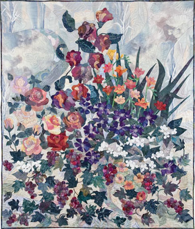 42 x 40 inches Machine pieced, hand appliquéd and machine quilted This quilt, which is predominantly hand appliquéd, was started as a portable project to take with me when I travel. I just kept adding different types of flowers as the spirit moved me. I worked on it for four or five years. |